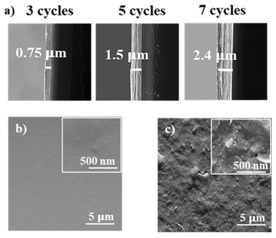 (a) SEM images of 3, 5, and 7 printed cycles of GOx ink after sintering at 300 °C. (b) SEM images of top surface of the printed GOx electrode before sintering and (c) after sintering.