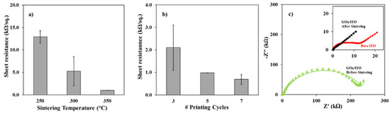 (a) Resistivity versus sintering temperature for 30 min following five printing cycles. (b) Resistivity versus number of printing cycles following sintering under fixed conditions (350 °C for 30 min). (c) Nyquist form of the EIS plot for bare ITO and GOx/ITO (before and after sintering).
