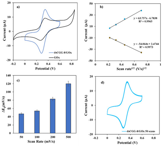 (a) Cyclic voltametric curves before and after adsorption of dsCGG-8 on GOx. (b) Plot of cathodic and anodic voltametric current of dsCGG-8 as a function of square root of scan rate. (c) Cathodic–Anodic peaks separation (∆Ep) versus scan rate for the dsCGG-8 modified electrodes. (d) 50 scans of CV curves of dsCGG-8 on GOx electrode. The electrochemical measurements were performed in presence of 1 mM Fe(CN)63−/4− using Pt wire counter electrode and Ag/AgCl (3 M KCl) reference electrode. Scan rate for CV measurement is 100 mV/s. Concentration of dsCGG-8 was 10 nM.