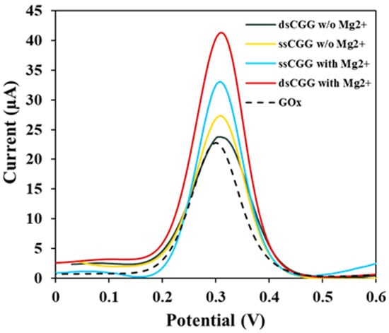 The electrochemical current of the surface-adsorbed dsCGG-8 (10 nM) was investigated on the GOx electrode by voltametric techniques. Figure 4a shows cyclic voltametric curves before and after DNA modification of the GOx electrode. The integrated peak current of the dsCGG-8/GOx (12.5 µA) is almost twice the GOx current (6.5 µA). The enhanced charge transport behavior of the DNA modified GOx electrode was monitored over a range of 50–500 mV/s scan rates (Figure 4b), which follows the Randles–Sevcik equation model wherein peak current is proportional to square root of the scan rate [37]. However, Figure 4c shows that cathodic-anodic peaks separation (∆Ep) increases with the scan rate (see cyclic voltamogram in Figure S3), which is an indicative of a quasi-reversible electron kinetics at the electrode surface and is typical to the DNA modified electrodes [38]. Figure 4d shows the cyclic voltammetry performed up to 50 scans for the DNA modified GOx electrode, which presents no substantial change in the peak current and overpotential with the number of scans, thus it suggests a stable DNA/GOx interface. We attribute this strong adsorption affinity to mild oxidation of the graphene sheets in the GOx ink (C/O = 1.5), similar to recently reported strong adsorption of ssDNA and dsDNA on graphdiyne surface with a low oxidation degree [39]. Moreover, high cationic strength screens negative charge between the two materials and facilitates the adsorption. There is an intriguing question of whether this current enhancement is due to the DNA mediated electron transport or enhanced diffusion of the redox probe owing to high cationic strength environment. To test the effect, we added EDTA in the DNA solutions to chelate the Mg2+, followed by incubation of the mixture with the GOx electrode. Figure 5 shows the DPV current of ssCGG-8 and dsCGG-8 in the presence and absence of Mg2+ and compared with the unmodified GOx electrode current. Evidently, the current in the absence of Mg2+ is very similar to background current or unmodified GOx current (~22 µA). This result confirms the dual role of Mg2+, i.e., promoting the DNA adsorption as suggested previously [15], and reducing the electrostatic repulsion between the redox probe and the electrode surface. It is important to note that DNA modified electrodes have shown higher resistance to charge transfer than that of unmodified electrode in low cationic strength due to lack of diffusion of the redox probe [40], which was improved after the addition of divalent cations [41,42,43]. Based on these results, we conclude that the high concentration of divalent cations in the environment screen the negative charge on both materials, which ultimately increases the diffusion of the redox probe, Fe(CN)63−/4−, to the electrode surface leading to higher current response.