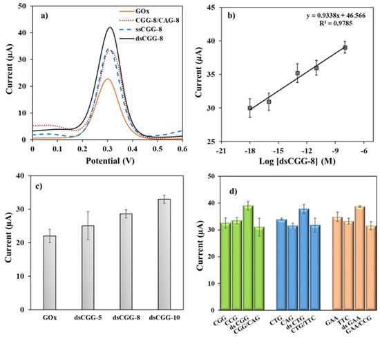 Next, we tested the current responses of conformation, concentration, length, and sequence types of DNA using DPV. Figure 6a shows the DPV curves of GOx, ssCGG-8, dsCGG-8, and a noncomplementary mixture of CGG-8/CAG-8 at 10 nM concentration. The current response of the double-stranded conformation (dsCGG-8) was higher than the single-stranded conformation (ssCGG-8), while the current response of the noncomplementary mixture showed similar current response as the single-stranded conformation, which corroborates the fact that noncomplementary strands remained unhybridized and in single-stranded conformation. Figure 6b shows the current response of dsCGG-8 over a range of 1 aM to 10 nM. The least-squares regression for dsCGG-8 formed a linear curve fit with a correlation coefficient R2 = 0.9785 (Figure 6b). The detection limit signal, LODy, was obtained using LODy = (blank signal + 3*SDblank) − intercept; where blank signal = 22 µA, 3*SDblank = 3*2.5 µA, and intercept = 46.566 µA. Then, the ‘theoretical’ limit of detection concentration, LODx, was determined as 0.8 aM by calculating antilog (LODy ÷ sensitivity), where sensitivity or the slope of the curve ‘m’ is 0.9338. Figure 6c shows the current responses of dsCGG comprising 5, 8, and 10 dsCGG repeat units (i.e., 15, 24, and 30 nucleotide lengths respectively) at 1 aM concentration regime. The upward trend of the current response with respect to length indicates that the increase in DNA adsorption aided by Mg2+ facilitates the charge transport at the interface. This length-dependent current response may lead to sensitive and label-free discrimination of normal and abnormal lengths of DNA repeat sequences associated with neurodegenerative diseases, as reported recently on MoS2 nanosheets surfaces [44]. Then, we tested the adsorption of various single-stranded, double-stranded, and noncomplementary sequences of same length (i.e., 8 trinucleotide repeats or 24 nucleotides) at 10 nM concentration. Figure 6d shows the current responses of trinucleotide repeat types CGG, CAG, and GAA (single-, double-, and noncomplementary) revealing the following trends. First, the current responses of double-stranded conformations, in all cases, are higher than their single strands. Second, the noncomplementary responses are similar to single-stranded conformation. Third, the current responses for all sequences are similar with respect to their conformation. Overall, we learn that the increase in DNA interaction with the surface in the high cationic environment increases the current response, which can be indicative of its conformation, concentration, and length. Despite the differential adsorption affinity of graphene-based materials for different nucleotide types, the DNA adsorption was sequence-independent. This result can be rationalized as the effect of high concentration of Mg2+ perhaps masks the sequence-dependent affinity between DNA and GOx.