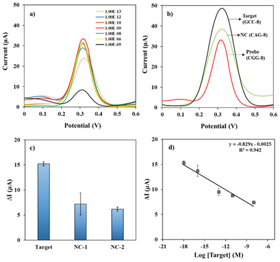 DPV current of (a) different concentration of probe sequence (ssCGG-8), (b) 1 nM probe, surface hybridized target (GGC-8) and noncomplementary (CAG-8) at 1 aM concentration. (c) Difference in current ∆I (target current − probe current) for complementary (CCG-8) and noncomplementary targets (NC-1 = TTC-8 and NC-2 = CAG-8), and (d) ∆I versus concentration of the surface hybridized CCG-8 [Target]. Hybridization time 1 h.