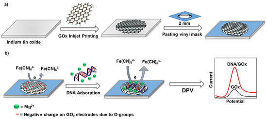 (a) Illustrating fabrication of electrodes by inkjet printing of exfoliated few-layered oxygen functionalized graphene (GOx) on indium tin oxide substrate, followed by adhesion of a vinyl mask selectively exposing a GOx surface with 2 mm diameter. (b) Depiction of sensing mechanism: the lower current on the unmodified electrode is due to the repulsion between the negatively charged redox probe and the negative O-groups on the GOx surface. Adsorption of DNA sequence on a GOx surface in presence of Mg2+ ions reduces the electrostatic repulsion, which leads to higher diffusion of the redox probe producing higher electrochemical current measured by DPV.