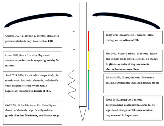 On the other hand, Lenarz et al.’s 2007 study using regimented stimulation did reduce the range of observed FBR. There is evidence that excessive current and stimulation will destroy local tissue and produce the FBR, similar to the burning effect in electrosurgical cauterization [43]. This principle is employed in a disciplined manner in laser intra-thermal therapy, to target epileptogenic tracts of nerves or tumour [44,45]. There is an argument, however, that stimulation at lower intensities, mimicking normal cortical activity as in Lenarzs study, may in fact have the inverse effect and reduce the FBR. In a way, stimulating local tissue into attenuating the FBR and recovering more quickly. Themes in the literature would support this, as otherwise inflammatory and traumatic lesions that also undergo less FBR, tend to heal better and with greater plasticity if the lesions and their surrounding tissues are stimulated [46,47]. This technique does pose obstacles for electrodes designed purely for recording, however, as unlike electrodes with a primary function of stimulation (such as DBS electrodes), passing current through electrodes reserved purely for recording may produce adverse effects. They may cause a plethora of deficits depending on the target region. As such, for the moment, the evidence from our review does not support the method of modifying local electrophysiology as a means of tackling the FBR.