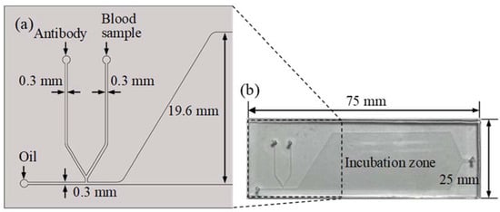 The micro-droplet-based blood typing chip was fabricated with a standard soft lithography process composed of two layers. The top layer was a PDMS layer with a microchannel and an incubation chamber. The bottom layer was a glass substrate. The glass slide was spin-coated with a thin PDMS to ensure that all the microchannels had the same surface property. The microchannel was treated with Aquapel (PPG Industries, Pittsburgh, PA, USA) to form a hydrophobic property before the sample and oil were injected [31]. The schematic illustration of the chip design is shown in Figure 1a. A T-junction microchannel was used for the droplet formation. Two side channels with 300 μm widths were merged near the T-junction. Packed red blood cells from the donor and anti-B antibodies were injected into the two side channels and merged as a water phase. The water phase was then cut by the oil phase to form droplets. The droplets flowed into an incubation chamber for the red blood cell agglutination reaction. The microchannel and incubator chamber were 100 μm in height. The size of the microfluidic chip was 25 × 75 mm, as shown in Figure 1b.