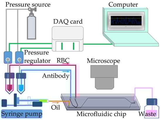 To generate uniform-sized droplets for the red blood cell agglutination reaction, both side channel flow rates were controlled by a pressure-driven flow with pressure regulators (VSO-EP-Miniature Pressure Controller, Parker, NA, USA). The pressure regulators were precisely controlled by LabVIEW software (Version 11.0, National Instruments, Austin, TX, USA) with an interface card (DAQ, USB-6281, National Instruments). The continuous phase with fluorinate oil (HFE-7500, 3M, Saint Paul, MN, USA) was introduced by a syringe pump (Legato 180, KD Scientific Inc., Holliston, MA, USA). Red blood cell agglutination reaction in the droplets was observed under a microscope (BX43, Olympus, Tokyo, Japan) and images were recorded with a digital camera (ILCE-5100Y, Sony, Tokyo, Japan). The presence of agglutination was quantitatively evaluated by monitoring a decrease in the area ratio of the blood cell image in the droplet over time. The area ratio was analyzed using ImageJ software. The schematic illustration of the experimental set-up is found in Figure 2.