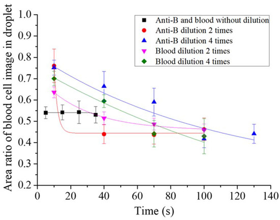 First, we tested the optimal reaction concentrations of the blood sample and antibody solutions in the micro-droplet platform. The undiluted blood sample was reacted with the original concentration of the two-times-diluted anti-B antibody and the four-times-diluted antibody samples. Following that, the undiluted anti-B antibody sample was reacted with the original concentration of blood sample, the two-times-diluted and the four-times-diluted blood samples. The agglutination extent was described quantitatively for the type B blood reaction. Each experimental group reaction was recorded, and we evaluated the presence of agglutination by monitoring a decrease in the area ratio of the blood cell image in the droplet over time. At the beginning of the reaction, red blood cells were distributed uniformly in the droplets, thus the area ratio of the blood cell image was large. The ratio decreased over time when more and more cell agglutination took place, as shown in Figure 3. We observed that the agglutination in the experimental group without blood dilution or antibody immediately reached (within 3 s) a steady state when they encapsulated in the droplet with an area ratio of 0.53–0.54. The agglutination rate was slowest with the experimental group of four-times-diluted antibody. The area ratio of the blood cell image in the droplet dropped from 0.75 to 0.44 over 130 s.