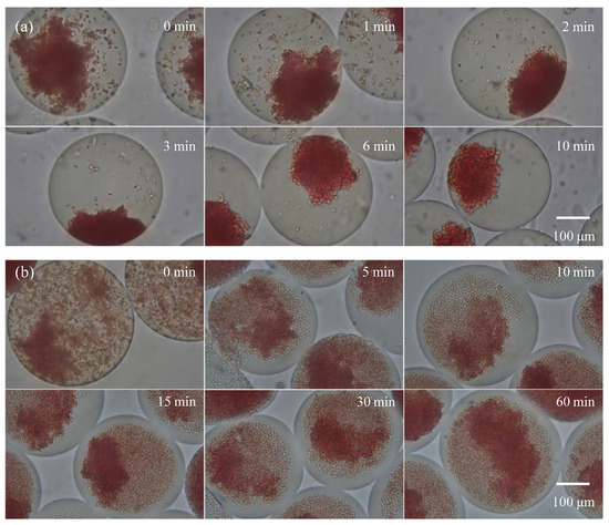 For this experiment, the undiluted type B and type B3 blood samples were encapsulated with the undiluted anti-B antibody sample in droplets for agglutination. A 20X objective lens was used for observation. Figure 4a shows the agglutination reaction for type B blood: When droplets were formed, steady state agglutination was seen immediately (within 3 s). Figure 4b shows the agglutination reaction for type B3 blood with an extended agglutination time reaction. After the droplet was formed, immediate agglutination occurred, which was similar to the results for type B blood. However, the ratio of agglutinated red blood cells was lower than type B blood, and steady state was reached at more than 120 s of reaction, i.e., the ratio of agglutinated red blood cells no longer increased. At this point, red blood cells settled to the bottom of the drop from gravity. Therefore, most red blood cells were within the depth of field, allowing for clearer observation of the agglutination. When the reaction time increased to 60 min, there was no further change in the ratio of agglutinated red blood cells in the droplet, and a similar ratio of agglutinated red blood cells was present in every drop. Note that the observation areas in Figure 4 are fixed. Because the observation time lasted an hour and the droplets moved slightly in the micro chamber, different droplets were captured in the video clips. The variation between different droplet images was less because of the highly consistent reaction in the droplet platform, which is crucial for the study of the mechanism of blood agglutination.