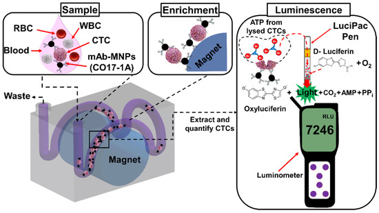In this study, we report on a sensitive and rapid method to isolate and simultaneously detect CTCs in blood using a 3D printed immunomagnetic concentrator (3DPIC) and the ATP luminescence assay, a procedure requiring a total of 30 min, including 20 min of incubation time (Figure 1). MNPs (average diameter, 50 nm) were conjugated with a monoclonal antibody (mAb) targeted to epithelial cell adhesion molecule (EpCAM), one of the CTC biomarkers [25]. Colon and breast cancer cells were first enriched in 3DPIC through IMS and later enumerated using the ATP luminescence assay. The specificity of the enriched cells was verified using immunostaining. To demonstrate its feasibility for isolation and detection of CTCs in blood, either colon or breast cancer cells in 1 mL of blood were enriched using 3DPIC at 5 mL/min. This allowed the ATP luminescence assay to detect as little as 10 cells in the blood within several minutes. This is the first time that the ATP luminescence assay is used for the detection of cancer cells in blood.