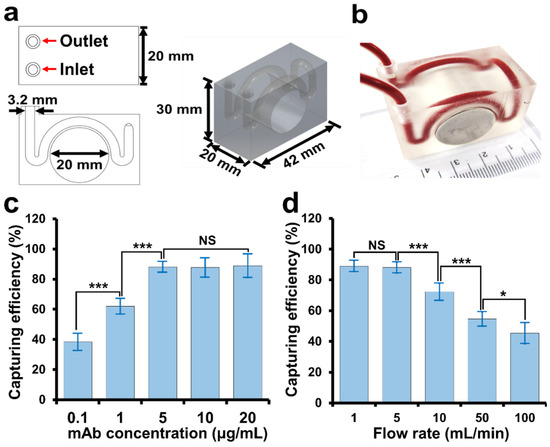 Fabrication and optimization of 3DPIC. (a) Design and (b) printed image of 3DPIC. The 3DPIC consists of a round channel with a diameter of 3.2 mm and a cylindrical hole holding a permanent magnet (diameter, 20 mm). (c) Effect of the concentration of mAb on the capturing efficiency of Caco-2 cells by 3DPIC. Two hundred microliters of MNPs (1010 particles/mL, final conc.) that were previously conjugated with mAb at different concentrations (0.1–20 µg/mL) in PBS were mixed with Caco-2 cells (104 cells/mL, final conc.) in 10 mL of PBS and incubated at 37 ℃ on an orbital shaker at 200 rpm for 20 min. Then, the mixture was injected into 3DPIC at 5 mL/min. The captured cells were counted using the ATP luminescence assay. (d) Capturing efficiency of CTCs (104 cell/mL) in 10 mL of PBS at different flow rates (1–100 mL/min) with MNPs conjugated with the mAb at 5 µg/mL. Student’s t-test, NS: non-significance, *: p < 0.05, and ***: p < 0.001. Sample number (n) = 3.