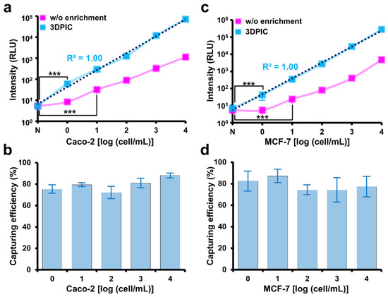 Isolation of cancer cells from PBS by 3DPIC and determination of the number of isolated cancer cells by the ATP luminescence assay. Number of Caco-2 (a) and MCF-7 (c) cells at different concentrations (1–104 cells/mL, final conc.) in 10 mL of PBS determined by the ATP luminescence assay with and without 3DPIC. Capturing efficiency of Caco-2 (b) and MCF-7 (d) cells at different concentrations (1–104 cells/mL, final conc.) in 10 mL of PBS by 3DPIC. Student’s t-test, *** p < 0.001, n = 3.