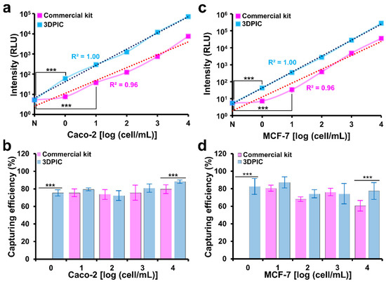 Comparison between 3DPIC and a commercial cell separation kit for cancer cell isolation. Number (a,c) and capturing efficiency (b,d) of Caco-2 (a,b) and MCF-7 (c,d) cells at different concentrations (1–104 cells/mL, final conc.) isolated by the commercial kit and 3DPIC using the ATP luminescence assay. Student’s t-test, *** p < 0.001, n = 3.
