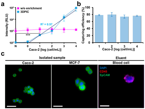 Spike test in blood. (a) Luminescence change for CTCs at different concentrations (1–104 cells/mL) in blood in 3DPIC. (b) Capturing efficiency at different concentrations of CTCs (1–104 cells/mL) in 1 mL of blood in 3DPIC. (c) Immunostaining of CTCs (Caco-2 and MCF-7 cells) and blood cells after capturing and isolation. CTCs were in the isolated sample, and blood cells were in the eluent. The cells were stained using CD45 (red), EpCAM (green), and DAPI (blue). The scale bar is 50 μm. Student’s t-test, *** p < 0.001, n = 3.