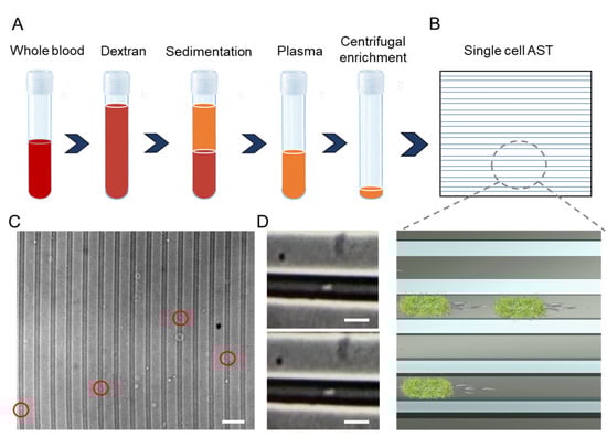 Here, we report a culture-free sample preparation workflow for rapid microbiological analysis of BSI (Figure 1A,B). The workflow starts with dextran sedimentation for red blood cell (erythrocyte) depletion, which has been applied for immunological analysis, such as neutrophil purification, and other biomedical applications [19,20]. We evaluate the capability of the dextran sedimentation procedure for depleting red blood cells while maintaining the bacteria in the sample. We also test the efficiency of the procedure for common bacterial pathogens, such as Escherichia coli, Klebsiella pneumoniae, Enterococcus faecalis, and Staphylococcus aureus, and optimize the procedure to minimize species-specific bacteria-mediated coagulation [21,22]. The dextran-isolated bacteria are then enriched by centrifugation, providing an effective method for red blood cell depletion compared to the complex selective lysis or gradient centrifugation techniques currently employed [11,23]. The enriched sample is loaded into a microfluidic device for determining the presence of bacteria in the sample and phenotypic single-cell AST (Figure 1C,D). We demonstrate the blood-to-AST workflow in less than 2 h compared to 5–7 days using the standard blood tube culture-based techniques in clinical laboratories.