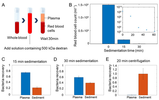 Dextran sedimentation for blood cell removal. (A) Schematic of the dextran sedimentation protocol for the removal of blood cells. (B) Blood cell removal efficiency. The cell count decreases exponentially with the sedimentation time. Inset, the data are plotted in semi-log scale to illustrate cell removal for several orders of magnitude. (C,D) Bacteria recovery (portion of total bacteria) with 15 and 30 min of dextran sedimentation. (E) Bacteria recovery and sample volume reduction by a soft spin at 200 g for 20 min. Data represent mean ± s.e.m. (n = 3).
