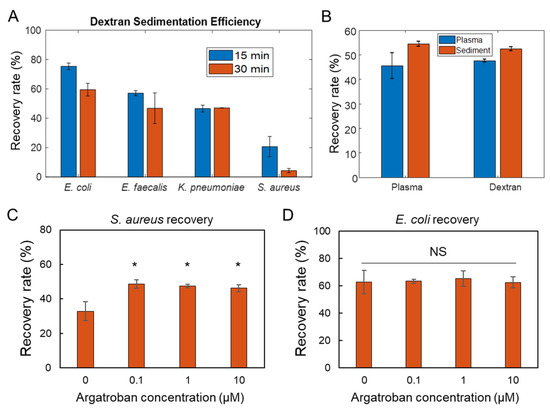 Dextran sedimentation efficiency for common pathogens. (A) Recovery rates of E. coli, E. faecalis, K. pneumoniae, and S. aureus after dextran sedimentation. (B) Control experiments with plasma and dextran solution for characterizing the recovery rate of S. aureus. (C,D) Recovery rates of S. aureus and E. coli with a thrombin inhibitor, argatroban. The results were obtained after 30 min dextran incubation. Data represent mean ± s.e.m. (n = 3). One-Way ANOVA with Tukey’s HSD test. * p < 0.05, NS = not significant.