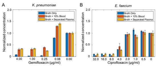 One of the goals of our study is to perform direct AST without the time-limiting blood culture step. To evaluate if dextran and the remaining blood component influence the AST result, we performed AST experiments with broth only, broth with 10% blood, and dextran-isolated plasma with MH broth at 1:1 ratio. The broth-only case represented a standard AST condition. The broth with 10% blood was included to evaluate the influence of blood components (cells and proteins) on the MIC. The separated plasma mixed with MH broth at 1:1 ratio tested the effect of dextran and represented the AST condition in the proposed workflow. The experiment was performed in K. pneumoniae and E. faecium (Figure 4). Our results suggested the MIC was not affected by the inclusion of 10% blood or dextran separation protocol. For example, the E. faecium has a MIC between 4 and 8 μg/mL in all three conditions. These results further support our workflow for direct AST from whole blood samples.