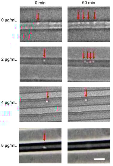 We further demonstrated the workflow for single–cell AST. The microfluidic device trapped bacteria in one–dimensional channels, and the bacteria were allowed to grow along the channel for phenotypic AST. The antimicrobial susceptibility of an E. coli clinical isolate to ampicillin was tested as a demonstration (Figure 5). The sample was separated into four tubes and mixed with different concentrations of antibiotics. The MIC of the bacteria strain was between 2 and 4 µg/mL. The growth of bacteria was only observed when the concentration of ampicillin was below 2 µg/mL. At a higher concentration (e.g., 8 µg/mL) of ampicillin, which is bacteriolytic, some bacteria were lysed during the duration of the experiment. The MIC value was below the susceptible breakpoint for Enterobacteriaceae according to the Clinical and Laboratory Standards Institute (CLSI) guideline. The result was in categorical agreement with the clinical microbiology laboratory report [14,27]. The data demonstrated the workflow for the rapid diagnostics of BSI from whole blood to AST.