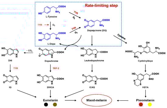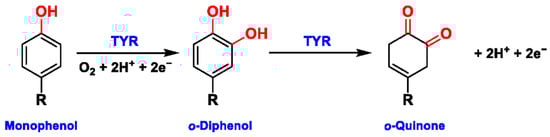 Tyrosinase (TYR, E.C. 1.14.18.1), a type-3 binuclear copper-containing oxidoreductase, efficiently catalyzes o-hydroxylation of monophenols to diphenols (monophenolase activity) and the oxidation of diphenols to quinones (diphenolase activity), without any additional cofactors (Figure 1) [1,2]. It is ubiquitously distributed in organisms ranging from bacteria to eukaryotes and plays a pivotal role in the enzymatic browning of fruit or fungi, as well as mammalian melanin synthesis [3,4]. In mammals, melanin is exclusively synthesized in melanosomes via complex biochemical reactions (Figure 2), and this endogenous substance is primarily responsible for the pigmentation of retina and skin [5,6]. TYR catalyzes the first two steps in melanin biosynthesis: the o-hydroxylation of L-tyrosine and the oxidation of L-DOPA. Since the remainder of the reaction sequence can proceed spontaneously at physiological pH, the conversion of L-tyrosine to dopaquinone (DQ) has been implicated as a crucial rate-limiting procedure in melanogenesis [7,8]. DQ could spontaneously convert into dopachrome, which gradually decomposes into 5,6-dihydroxyindole (DHI) and 5,6-dihydroxyindole-2-carboxylic acid (DHICA) through a succession of redox reactions [5,9]. Ultimately, these dihydroxyindoles are oxidized to eumelanin. Alongside, in the presence of cysteine or glutathione, DQ is converted to 5-S-cysteinyl dopa or glutothionyl dopa, finally yielding pheomelanin [10,11]. The types and relative amounts of these melanin constitute color-based ethnic diversification. Three tyrosinase-like enzymes co-regulate melanogenesis, including TYR and TYR-related proteins 1 (TRP-1) and 2 (TRP-2). TRP-1 shows DHICA oxidase and low tyrosine hydroxylase activity when zinc is replaced by copper. TRP-2 contains two zinc ions at the active site and isomerizes dopachrome to DHICA. They are metal-containing glycoproteins and share ~40% amino acid sequence identity and ~70% similarity [1]. Despite TYR and TYR-related proteins 1 (TRP-1) and 2 (TRP-2) being necessary for melanogenesis, TYR is the most critical rate-limiting enzyme [10].