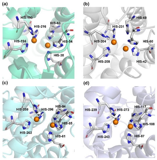 The conserved cavity of TYR from different sources. (a) The crystal of TYR from Streptomyces castaneoglobisporus (PDB ID: 2ZMX). (b) The crystal of TYR from Bacillus megaterium (PDB ID: 3NQ1). (c) The Crystal of TYR from fungus (PDB ID: 2Y9W, Agaricus bisporus). (d) The Crystal of TYR from plant (PDB ID: 5CE9, Juglans regia). Two copper ions (orange) are coordinated with three histidine residues, respectively.