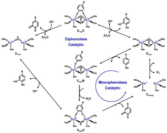 Human TYR is a glycoprotein (13% carbohydrate) predominantly located in the melanosome membrane of melanocytes [23,24]. The presence of the transmembrane domain and glycans renders it difficult to isolate homogeneous TYR from melanocytes, which impedes crystallographic studies. Fortunately, the most characteristic TYR can be acquired from Streptomyces glausescens, the fungi Neurospore crassa, or Agaricus bisporus [7,25,26]. To compare the conservation of catalytic cavity, the crystal structures of TYR from bacteria (Streptomyces castaneoglobisporus [25] and Bacillus megaterium [27]), fungi Agaricus bisporus [28], and walnut leaves [29] were retrieved from Protein Date Bank. A salient feature of TYR from various sources (Figure 3) is the presence of strictly conserved binuclear copper atoms at the active site, each of copper atoms is coordinated with three conserved histidines, respectively [3]. Moreover, the normal redox state of copper atoms is exceedingly significant for enzyme activity. Due to the relatively high similarity and homology with mammalian TYR, mushroom TYR from Agaricus bisporus acts as a model for enzyme kinetics and inhibitor screening [28,30,31]. Although extensive studies are devoted to TYR, its catalytic mechanism remains controversial. According to the presence/absence of oxygen and the oxidation state of copper ions [Cu (Ⅱ)/Cu (Ⅰ)], three enzymatic forms (Eoxy, Emet, and Edeoxy) participate in the catalytic cycle (Figure 4) [3,32]. The resting form of TYR is found to be a mixture of 85% met and 15% oxy forms, while only the latter could act on the monophenol [7,33,34]. During the monophenolase cycle, to form Eoxy-monophenol complex (EoxyM), the oxygen atom on the deprotonated monophenol is coordinated with the coppers of Eoxy. Then, the phenol is o-hydroxylated to generate Emet-diphenol (D) complex (EmetD) [26,35]. Reducing agents could well draw the Emet into the Edeoxy, with concomitant oxidation to the corresponding o-quinone [36]. Since the deoxy form is the only one capable of reacting with oxygen to regenerate Eoxy and continue the catalytic action, monophenolase activity usually manifests as a characteristic lag time until a sufficient amount of catechol helps Emet to become Edeoxy [36]. Remarkably, this period depends on several factors, including enzyme concentration, monophenol concentration and the presence of reducing agents, especially o-diphenol derivatives (such as L-DOPA) that could shorten and even abolish the lag time [30,33,37]. In the diphenolase cycle, Eoxy continues to bind o-diphenol to originate the EoxyD complex, while both Eoxy and Emet are capable of oxidizing the diphenol to the o-quinone. After this, Emet is regenerated to complete the catalytic cycle continuously [30,34].