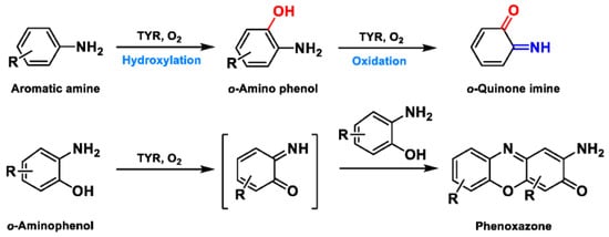The catalytic reaction of TYR-mediated aromatic amine and o-aminophenol. Adapted with permission from ref. [43]. 1987, American Chemical Society.
