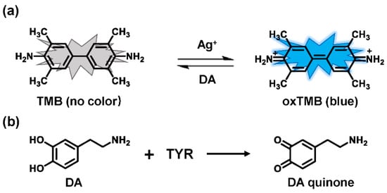 In recent years, some breakthroughs have been made in substrates identification and detection means. Several sensing platforms utilized the reducibility of catechol to capture some chromogenic reagents for quantitative analysis [62,63]. For instance, Ag+ could oxidize 3,3′,5,5′-tetramethylbenzidine (TMB) to the oxidized 3,3′,5,5′-tetramethylbenzidine (oxTMB), accompanied by remarkable changes in color and absorbance [64,65]. The introduction of reducing substances (such as DA) directly decreases oxTMB, resulting in faded blue and a decrease in absorbance (Figure 6). Accordingly, using TMB as a chromogenic probe, a facile colorimetric assay was proposed to sense TYR activity in human serum samples and to screen inhibitors [66]. In a similar vein, Deng et al. demonstrated that catechol could suppress the activity of oxidase-mimicking chitosan-stabilized platinum nanoparticles (ChPtNPs), thereby significantly decreasing acidified TMB products [67]. With the oxidation of catechol, a linear relationship between the amount of restored color and the TYR activity was evaluated. In terms of detection means, inspired by specific chromogenic and fluorogenic reactions between resorcinol and catecholamines [68], an absorbance–fluorescence dual-readout assay was established. With tyrosine as a substrate, this assay achieved the determination of TYR in serum samples and inhibitor screening [69]. Notably, these innovative assays are consistent with the L-DOPA oxidation-based method.