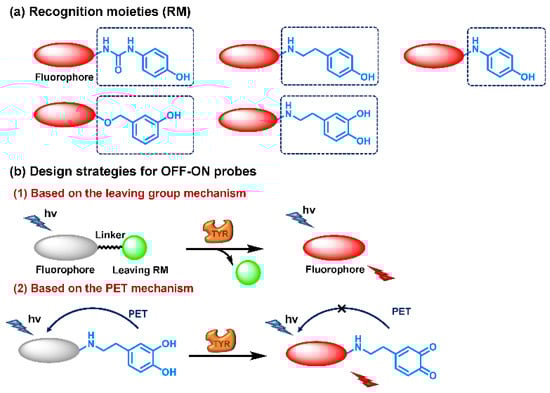 Several strategies reported for designing the fluorescent substrates of TYR. (a) Some typical warheads of fluorescent probe for TYR detection. (b) Two sensing mechanisms of OFF-ON probes towards TYR.