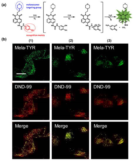 - Zhou, J.; Shi, W.; Li, L.; Gong, Q.; Wu, X.; Li, X.; Ma, H. Detection of Misdistribution of Tyrosinase from Melanosomes to Lysosomes and Its Upregulation under Psoralen/Ultraviolet A with a Melanosome-Targeting Tyrosinase Fluorescent Probe. Anal. Chem. 2016, 88, 4557–4564. [Google Scholar] [CrossRef]