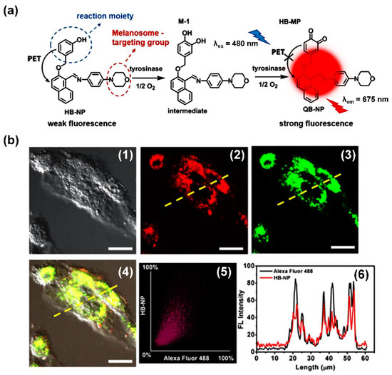 (a) The mechanism of TYR activity detected by HB-NP. (b) Colocalization of HB-NP and Alexa Fluor 488 (a commercial dye) in B16 cells [80]. (1) Bright-field image of the B16 cells; (2) fluorescence image of the red channel for HB-NP; (3) fluorescence image of the green channel for Alexa Fluor 488 (λex = 488 nm, λem = 500–555 nm); (4) the merged image of (1)–(3). (4) Intensity correlation plot of HB-NP and Alexa Fluor 488. (6) Intensity profile of the linear ROI across the cell (yellow line in images (2)–(4)). Copyright permission is granted by American Chemical Society.