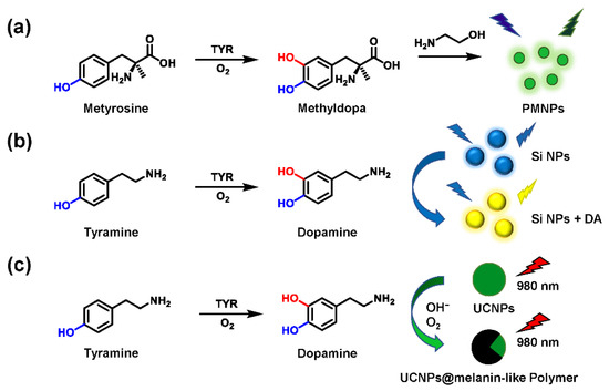 Other than small molecular probes, nanometer material-based biosensors have also aroused considerable interest in the detection of biological analytes. Some emerging nanomaterials utilize the characteristics of TYR-mediated metabolism to trigger a linear fluorescence response with intermediates. For example, under aerobic and alkaline conditions, dopamine is converted to polydopamine via oxidation and self-polymerization. Enlightened by the intrinsic fluorescence properties of polydopamine, Liu et al. prepared the fluorescent polymethyldopa nanoparticles (PMNPs) [99]. Metyrosine acted as a substrate of TYR to yield methyldopa (a dopamine analog). The latter further reacted with ethanolamine to produce PMNPs (Figure 11a). Ultimately, the strategy of in situ formation of fluorescent PMNPs performed well in screening inhibitors. Using a similar principle, Ding et al. introduced tyramine as a model substrate, which could be converted into DA by TYR. Based on the specific sensing between silicon nanoparticles (Si NPs) and DA, the solution color and fluorescence emission changed significantly (Figure 11b). Subsequently, a novel ratiometric fluorescence analysis was established for screening TYR activators and inhibitors [100]. Wang et al. developed a fluorescence-sensing platform utilizing rare-earth-doped upconversion nanoparticles (UCNPs) [101]. Tyramine was oxidized to DA and further yielded melanin-like polymers, leading to the effective quenching of UCNPs (Figure 11c). Collectively, most nanoparticle-based fluorescent probes have fulfilled relevant drug screening protocols. Some potential factors, including complicated synthesis, time-consuming sample pretreatment, homogeneity, and stability of nanoparticles, deserve adequate consideration. Furthermore, compared to traditional colorimetry, both methods seem to be suitable only for TYR activity evaluation in vitro.