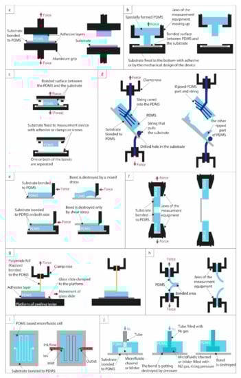 Another method for peel strength measurement is the so-called T-peel test, illustrated in Figure 1h, which is also adopted by standard bodies (e.g., ISO 11339 or ASTM D 1876) [52]. A drawback of this method is that it requires both parts of the bonded structure to be flexible. It is most commonly used to detach two bonded PDMS blocks, as in [54] and [55], but a PDMS block bonded with a flexible foil could also be investigated this way. Overall, peel tests are harder to be performed correctly and could be done on a limited number of substrate types. The resulting peel strength is also a bit less relevant than the more widely used tensile strength.