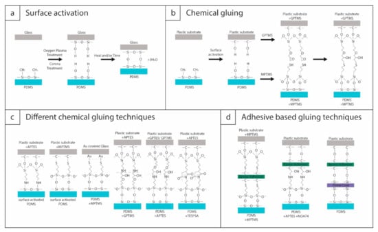 Illustrations of the process steps of (a) surface activation with oxygen plasma or corona treatment, (b) chemical gluing. (c) The most often used chemical gluing methods. (d) Adhesive-based or combined gluing methods.