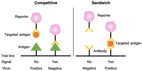 Currently, two common models of LFIA have been proposed, similar to ELISA, including competitive and sandwich models, as shown in Figure 2. The competitive assay that is designed for antigens has only one epitope that cannot simultaneously bind with two antibodies [40]. In the presence of analyte, the antibody–antigen interaction is formed, inhibiting the signal formation at the test line. Therefore, in the competitive test, the signal intensity is inversely proportional to the concentration of analyte in the sample. On the other hand, sandwich assay is used for analyte antigens, which has two epitopes that can simultaneously bind with two distinct types of antibodies, such as hCG used in pregnancy tests [41]. The targeted antigen is trapped between two antibodies at the test line, and therefore, the signal intensity is proportional to the amount of analyte in the sample.