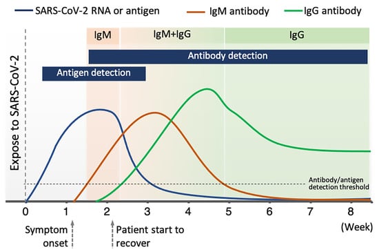 Immunoglobulin M (IgM) antibodies and Immunoglobulin G (IgG) antibodies are two common types of antibodies generated by the human immune system. A number of LFIAs have been developed for detecting antibodies in the blood of patients who are exposed to the SARS-CoV-2 virus. However, focusing on antibody detection may lead to false negative tests when the disease is at its early stages. This is because in the days immediately following infection, antibodies might be below detectable levels, as shown in Figure 3 [68,69]. It has been demonstrated that 2–3 days after the onset of symptoms, the levels of IgM antibodies (as surveillance antibodies) rise, reaching its peak after 2 weeks [70]. Nevertheless, the levels of IgM will quickly decrease within 3 weeks. In contrast, the levels of IgG antibodies (as attack antibodies) increase 10–14 days after the first onset of symptoms. Then, the levels of IgG remain elevated for 4–5 weeks and decrease and stabilize after 5–6 weeks.
