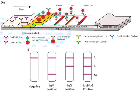 IgM–IgG combined antibody test for SARS-CoV-2 detection. (A) Schematic illustration of the LFIA device; (B) Results generated from the LFIA test. C: control line, G: IgG line, M: IgM line. Reprinted from [53].