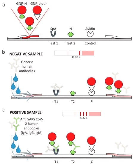 In order to achieve higher sensitivity, Calvalera et al. developed a multi-targeted LFIA that allows for the detection of total antibodies, including IgG, IgM, and IgA [55]. Staphylococcal protein A (SpA) and N protein of SARS-CoV-2 were used to construct the T1 and T2 test line, respectively (Figure 5). The control line consisted of avidin. AuNPs were labeled with N protein and biotin to act as reporters. SpA has been reported to bind with either human IgG antibody through Fc domain or IgM and IgA antibodies through Fab domains. Hence, the use of SpA and N protein antigen enables multi-target ability, and it results in a high sensitivity of 94.6% and 100% specificity. In addition, with the detection of IgA, the LFIA device seems to be a good early predictor of SARS-CoV-2, since IgA is known to be produced at detectable levels earlier than IgG and IgM [72].