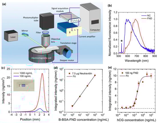 (a) Spin-enhanced lateral flow immunoassay (SELFIA) device. (b) Emission spectra of NC membrane and FNDs excited by a 532 nm laser. The asterisk (*) denotes unfiltered scattered laser light. (c) B-BSA-FNDs captured by the neutravidin bands formed on NC strips. The B-BSA-FND solution flowed from right to left. Inset: photo of a 1.5 μL trypan blue solution deposited on an NC strip to assist the assessment of the spot size of neutravidin. (d) Measured fluorescence intensities of B-BSA-FNDs captured by NC-bound neutravidin as a function of the B-BSA-FND concentration. (e) Sandwich SELFIA of hCG with anti-β hCG-coated FNDs and anti-β hCG deposited on NC strips. Reprinted with permission from [96]. Copyright © 2020, American Chemical Society.