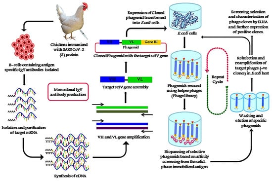 Production of anti-SARS-CoV-2 monoclonal scFv IgY antibodies against the spike protein (S) of SARS-CoV-2 antigen using phage display technology. Reprinted from [127]. Copyright 2020, with permission from Elsevier.