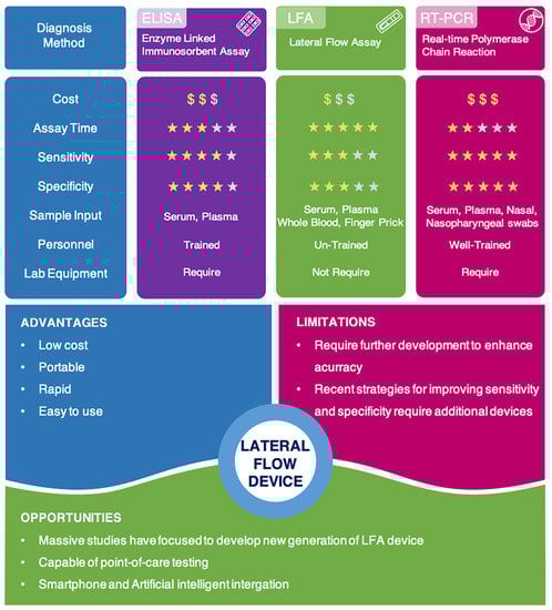 Among available POC testing techniques, the lateral flow immunoassay (LFIA) has been extensively researched and used for COVID-19 diagnosis, owing to its low cost, speed, and accessibility [13,14,25]. To diagnose COVID-19, lateral flow tests combine SARS-CoV-2 pathogen assays with antibodies in patients. LFIA tests usually take around 10–30 min, while the conventional ELISA takes approximately 2–5 h. The sensitivity of COVID-19 detection by LFIA ranges from 61% to 88% (10 days after the first onset of symptoms) to 100% (after 3 weeks) [28,29]. However, early detection of the disease is a real challenge for LFIA, due to its low accuracy in detection. The accuracy of an LFIA device is evaluated in terms of its sensitivity and specificity. Thus, many efforts have been made to achieve higher sensitivity and specificity for SARS-CoV-2 detection in order to reduce false negative/positive predictive results. In a recent report, Xiang et al. showed that redesigned LFIA can obtain comparable sensitivity to ELISA [30]. Similarly, Smith et al. evaluated the sensitivity of the Quidel SARS Sofia rapid antigen flow immunoassay (USA) against RT-qPCR [31]. All tests achieved higher than 98% sensitivity to detect infected patients if tests were administered every three days. These evaluations confirmed the possibility of developing an ultrasensitive, highly specific LFIA for POC testing.