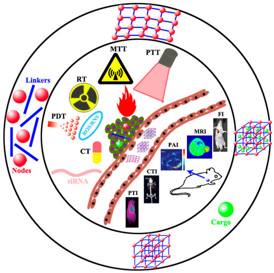 Cancer has been a serious threat to human health [1]. The accurate therapy of cancer still needs to overcome many great difficulties [2,3]. Each therapy, such as chemotherapy (CT), chemo-dynamic therapy (CDT), radiation therapy (RT), radio-dynamic therapy (RDT), microwave thermal therapy (MTT), microwave dynamic therapy (MDT), photothermal therapy (PTT), and photodynamic therapy (PDT), has its inherent advantages and defects [4,5,6]. Hence, the treatment of cancers has gradually developed from the past monotherapy mode to the current multimode synergistic therapy to enhance therapeutic effects. With the rapid development of nanotechnology, the realization of multimode synergistic therapy depends largely on how to integrate multiple treatment modes into a single nano-platform rather than purely carrying out physical mixing to obtain a simple additive treatment effect. In recent years, emerging and rapidly developing MOF materials have shown enormous potential in multimodal synergistic therapy because of their unique porous structure and characteristics. MOF is a kind of organic inorganic hybrid material through coordination bonds formation between metal ion/ion clusters nodes and organic ligand linkers [7,8,9,10,11]. MOF characterizes by variable compositions and structures, adjustable porosity and pore sizes, high surface areas, good biocompatibility, and biodegradability [7,12,13]. Weak coordination bonds can endow MOFs with a stable but degradable structure [14,15,16]. Nanoscale pores and an ordered crystal structure allow MOFs to accumulate in tumor through enhanced permeability and retention effect (EPR) [17,18]. At the same time, the organic linker can be additionally functionalized for targeting cancer therapy [19,20]. Furthermore, the good dispersibility and biocompatibility of specific MOFs can ensure the biosafety of targeting treatment in vivo [21]. Adjustable composition results in controlled synthesis with different morphology, size, and chemical properties, making MOF itself a nano-drug for multimodal imaging and therapy by choosing appropriate metal nodes and organic ligands [22,23]. Moreover, the porous and ordered structure and the high ratio surface areas are suitable for efficient loading of various cargos for multimodal imaging and therapy [24,25,26,27,28]. MOF-based nanomaterials were applied to fluorescence imaging (FL) [29,30,31,32], photoacoustic imaging (PAI) [33], magnetic resonance imaging (MRI) [34,35,36], computed tomography imaging (CTI) [37,38,39], photothermal imaging (PTI) [40,41] and positron emission tomography (PET) imaging [42,43,44,45]. It is worth mentioning that multimodal imaging [46,47,48,49,50,51,52] is beneficial for tumor diagnosis and accurate position. MOF-based heterogeneous hybridization may serve as an effective methodology for multimodal imaging and synergistic therapy. It integrates the advantages of various materials and endues the hybrid materials with whole new physicochemical properties, realizing theranostic nano-platforms through multimode imaging-guided therapy. In this review, the development of biodegradable MOFs as nano-drugs and nanocarriers for multimodal imaging and therapy in recent years will be summarized and discussed, as shown in Figure 1, and the prospects and challenges of MOFs in multimodal synergistic treatment will also be explored for promising clinic/biomedical applications.