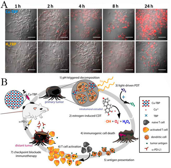 (A) B16F10 cellular uptake of Cu-TBP or H4TBP at different time-points after incubation with equivalent TBP concentrations of 20 mM observed by confocal imaging. Free H4TBP emits red fluorescence. Scale bar, 50 μm. (B) Synergy of Cu-TBP mediated radical therapy stimulated by hormone, light and checkpoint blockade immunotherapy. Reprinted with permission from Ref. [54]. Copyright 2019, Elsevier.