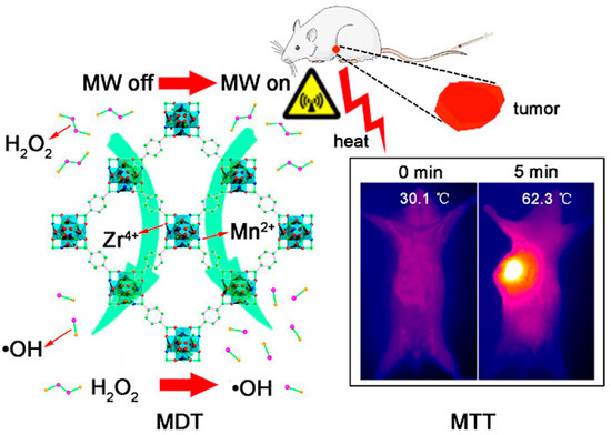 Zirconium(IV) chloride (ZrCl4), Manganese(II) chloride tetrahydrate, and 1,4-Benzenedicarboxylic acid (H2BDC) were used as raw materials to chemically synthesize Mn-doped Zr MOF by a one-pot hydrothermal method [55]. The flexible and microporous structure is beneficial to the strongly confined inelastic collision of ions, resulting in a significant microwave thermal conversion efficiency as high as 28.7%. The Mn-ZrMOF catalyzed the degradation of H2O2 to generate ·OH under MW irradiation. The in vitro and in vivo experimental studies confirmed that a union of MTT and MDT with simultaneous generation of heat and ROS under mild MW irradiation realized synergistic inhibition of the growth of tumors, as schematically reported in Figure 3. The Mn-ZrMOF was degradable in vivo and excreted out of the body gradually, demonstrating that it is a bio-safe therapeutic nano-agent.