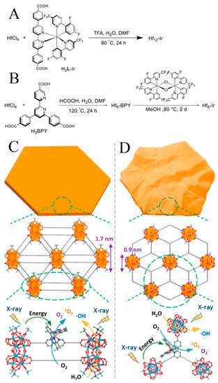 Lan et al. [56] reported two MOF nanolayers, Hf12-Ir, and Hf6-Ir (namely Iridium), schematically reported in Figure 4. Under X-ray irradiation, electron-dense Hf12 and Hf6 secondary building units not only generated ·OH to enhance RT but also transfered energy to photosensitizing Ir (2,2′-bipyridine) [2-(2,4-difluorophenyl)-5-(trifluoromethyl) pyridine]2+ to generate single oxygen (1O2) and O2−, resulting in RDT. RT and RDT exerted superb anticancer effects at shallow X-ray doses.