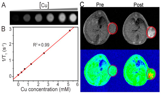 (A) MRI of the Cu-TCPP aqueous solution with different concentrations. (B) Plots of the 1/T1 value of the Cu-TCPP under concentration dependence. (C) mouse MRI before and after intratumoral injection of the Cu-TCPP. Red circles indicate the position of the tumor. Reprinted with permission from Ref. [41]. Copyright 2018, Ivyspring International Publisher.