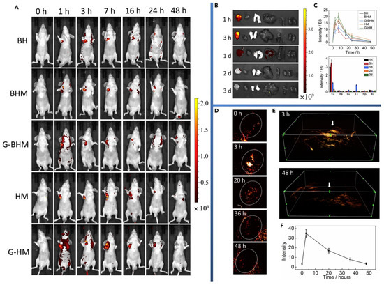 (A) Fluorescence imaging of SGC-7901 tumor-bearing model mice after intravenous injection of different materials at 7 time points. Unit of scale bar: (p/s/cm2/sr)/(mW/cm2). (B) Ex vivo Fluorescence imaging of tumor, heart, lung, liver, spleen, and kidney in sequence in SGC-7901 tumor-bearing model mice after intravenous injection of G-BHM at 5 different time points. (C) Time-dependent in vivo integrated FL intensity for different materials (top) and in different organs (bottom). (D) PA imaging of SGC-7901 tumor after injection of G-BHM at different time points. (E) Stereoscopic PA images, and white arrow represents tumor zone. (F) PA signal intensity variation corresponding to part (D). Reprinted with permission from Ref. [66]. Copyright 2019, Elsevier Inc.