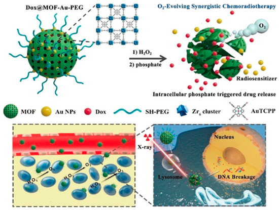 He et al. fabricated a MOF consisting of Zr6+ nodes and TCPP ligand [67]. The gold nanoparticles (AuNPs) were decorated on the surface of MOF, which was conducive to effectively stabilize the nanostructure and increased radiotherapy sensitivity. Meanwhile, chemotherapeutic drug doxorubicin (Dox) was encapsulated into the MOF. The fabricated MOFs were densely packed polyethylene glycol (PEG) corona to form Dox@MOF-Au-PEG. Dox@MOF-Au-PEG oxygenated tumor microenvironment by catalyzing the degradation of H2O2 in tumor into O2, resulting in enhancing O2-dependent radiotherapy. Dox@MOF-Au-PEG combined the radiotherapy sensitization effect of AuNPs and the anticancer effect of Dox, achieving synergistic chemoradiotherapy, as shown in Figure 7. The stronger coordination interaction between phosphate ion and zirconium made the MOF readily decompose in PBS (2 mM), resulting in the burst release of porphyrin ligands and structural collapse. Once MOF was internalized by cancer cells, the phosphate in high concentration led to the disassembly of the NPs.