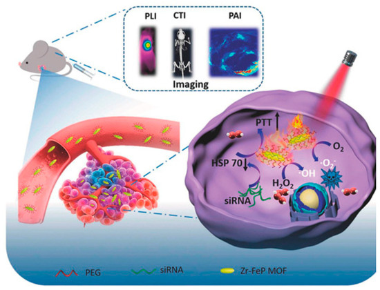 Zhang et al. [46] prepared a porous zirconium-ferriporphyrin MOF nano-shuttles (Zr-FeP) made from ZrOCl2∙8H2O and H4TBP-Fe, carrying the siRNA of 70 kDa heat shock protein (HSP70). Under NIR lasers, the siRNA/Zr-FeP MOF catalyzed endogenous H2O2 and O2 to become ·OH and 1O2, while it had high photothermal conversion efficiency up to around 34%. Moreover, siRNA reversed the HSP70-mediated thermotherapy resistance, achieving PTT at a lower-temperature and avoiding the nearby normal tissues from the nonspecific thermal radiation damage. The siRNA/Zr-FeP significantly suppressed the tumor cell growth in vitro and in vivo through the synergistic effect of PTT at a lower temperature and PDT, shown in Figure 8. siRNA/Zr-FeP was effectively cleared out of the organism, via its gradual decomposition into small molecules and ions. Meanwhile, MOF nano-shuttles achieved PAI, CTI, and photothermal imaging (PTI) tri-mode tumor-specific imaging capability, providing a powerful theranostic tool for tumors.