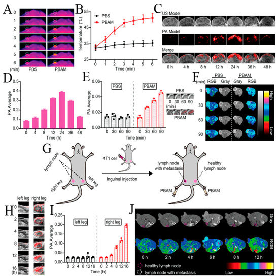 (A) Infrared thermal imaging and (B) tumor temperature of 4T1-tumor model mice after intravenous injection with PBAM under 808 nm laser (1 W cm−2). White circle: tumor tissue. (C) Tumor PAI and (D) Corresponding PAI signal intensity of 4T1-tumor model mice after intravenous injection with PBAM. (E) Tumor PA signal intensity and corresponding PAI of 4T1-tumor model mice after subcutaneous injection with PBAM. (F) MRI of 4T1-tumor model mice after subcutaneous injection with PBAM. White circle: tumor tissue. (G) Schematic of lymphatic metastasis tumor model. (H) PAI of lymph nodes with or without metastasis at different time points after injection with PBAM. White circle: the lymph nodes in left leg. Red circle: the lymph nodes in right leg. (I) Corresponding PAI signal intensity of lymph nodes with or without metastasis. (J) MRI of lymph nodes with or without metastasis at different time points after injection with PBAM. Reprinted with permission from Ref. [20]. Copyright 2020, WILEY-VCH Verlag GmbH & Co. KGaA, Weinheim.