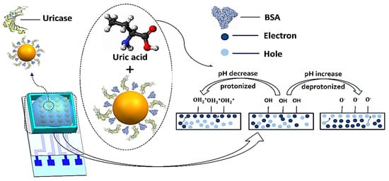The mechanism of our graphene-based biosensor detection of uric acid is shown in Figure 1. Uric acid is converted to allantoin, hydrogen peroxide, and carbon dioxide during the catalytic reaction of uricase and leads to local pH shifts in the reaction channel. Hydroxyl groups on the surface of the channel can be protonated to be as the pH decreases or deprotonated to be O− as the pH increases [22]. Therefore, according to the configuration of the electrical double layer at the graphene/electrolyte interface, make graphene n-doped and O− make graphene p-doped; n-doped and p-doped graphene is able to modulate the channel conductance by doping holes or electrons, which is consistent with other graphene studies [23,24,25].